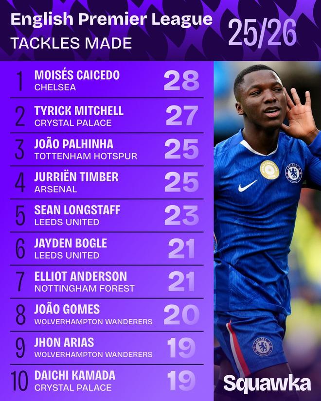 1. 莫伊塞斯-凯塞多(切尔西)28次