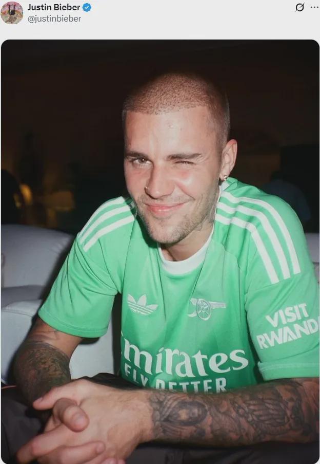 贾斯汀-比伯在社交媒体上发布了一张身穿阿森纳球衣的照片。